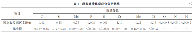 在斷裂面的遠(yuǎn)離裂紋源區(qū)取樣并對試樣進(jìn)行化學(xué)成分分析,結(jié)果如表1所示。由表1可知:螺栓材料符合標(biāo)準(zhǔn) GB/T 3077—2015《合金結(jié)構(gòu)鋼》對42CrMoA鋼的要求,同時(shí)其H元素含量極低,可排除氫致延遲裂紋導(dǎo)致開裂的可能性。