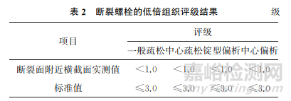 在螺桿斷裂面附近的橫截面截取試樣,并對其進(jìn)行檢驗(yàn),依據(jù)標(biāo)準(zhǔn) GB/T 1979—2001《結(jié)構(gòu)鋼低倍組織缺陷評級圖》、GB/T 226—2015《鋼的低倍組織及缺陷酸蝕檢驗(yàn)法》進(jìn)行檢驗(yàn),未發(fā)現(xiàn)殘余縮孔、氣泡、裂紋、夾雜、翻皮、白點(diǎn)、軸間晶間裂紋等缺陷,結(jié)果如圖3所示。低倍組織評級結(jié)果如表2所示。由表2可知:結(jié)果均滿足GB/T 3077—2015的要求。