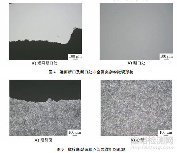 斷裂螺栓的化學(xué)成分符合相關(guān)標(biāo)準(zhǔn)要求。低倍檢驗(yàn)未發(fā)現(xiàn)殘余縮孔、氣泡、裂紋、夾雜、翻皮、白點(diǎn)、軸間晶間裂紋等缺陷。金相檢驗(yàn)未發(fā)現(xiàn)異常組織、晶粒粗大、未熔鐵素體、魏氏體及脫碳層,說明在熱處理過程中不存在過熱、欠熱、脫碳及氧化現(xiàn)象。力學(xué)性能測試結(jié)果均滿足標(biāo)準(zhǔn)要求。