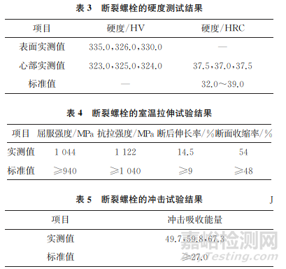 在螺桿的螺紋部位以上取樣,并對其進(jìn)行力學(xué)性能測試,參考 Q/HZJ 010001—2019《中國海裝企業(yè)技術(shù)標(biāo)準(zhǔn)》對42CrMoA 鋼的要求進(jìn)行對比分析。取樣后分別按照GB/T 4340.1—2009《金屬材料 維氏硬度試驗(yàn) 第1部分:試驗(yàn)方法》、GB/T 228.1—2010《金屬材料 拉伸試驗(yàn)方法》、GB/T 229—2007《金屬材料 夏比沖擊試驗(yàn)方法》進(jìn)行硬度測試、拉伸試驗(yàn)和沖擊試驗(yàn),結(jié)果如表3~5所示。由表3~5可知:斷裂螺栓的力學(xué)性能均符合標(biāo)準(zhǔn)要求。