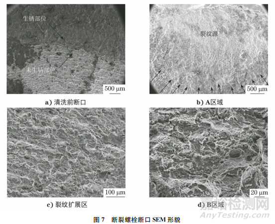 近圓形亮白區(qū)為裂紋源,裂紋沿亮白區(qū)邊緣向四周擴(kuò)展,形成 A 區(qū)域,A 區(qū)域在放置過程中生銹,清洗斷口后發(fā)現(xiàn)該區(qū)域具有脆性斷口特征;B區(qū)域斷口上存在較多的韌窩,使螺栓在安裝過程中受力而斷裂。