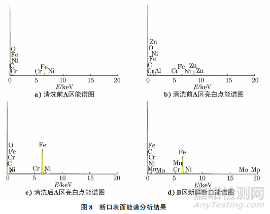 首先對銹漬清洗前斷口表面進(jìn)行能譜分析,結(jié)果如圖8所示。由圖8可知:斷口A區(qū)域表面為鐵銹,主要成分為O元素與Fe元素;生銹區(qū)域的亮白區(qū)中含有較多Al、Zn、O等元素,這與六角頭螺栓達(dá)克羅處理時(shí)噴涂液中的元素一致;清洗銹漬后亮白區(qū)的化學(xué)成分主要為O元素與Fe元素;B區(qū)域未發(fā)現(xiàn) Al、Zn、O等元素。