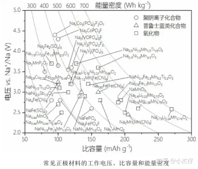 電池比能量主要由正負(fù)極材料性能影響。目前儲(chǔ)鈉材料中最理想的負(fù)極材料是硬碳,那么合適的正極材料對電池比能量的改善影響非常大。儲(chǔ)能正極材料的選擇條件:比容量高、工作電壓高、原料資源豐富、結(jié)構(gòu)穩(wěn)定性好,目前有氧化物、聚陰離子類、普魯士藍(lán)。