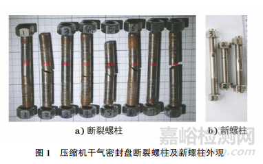 某100萬(wàn)t/a乙烯裝置三機(jī)組干氣密封盤螺柱發(fā)生斷裂現(xiàn)象,斷裂螺柱所在法蘭位于壓縮機(jī)附近,每個(gè)法蘭上有4個(gè)螺柱。斷裂螺柱及新螺柱外觀如圖1所示,現(xiàn)場(chǎng)一共8個(gè)法蘭上的螺柱斷裂。法蘭所在管道內(nèi)的壓力為3.8MPa,管道內(nèi)部分區(qū)域溫度為20~30℃,其他區(qū)域溫度為30~50℃。法蘭外表面無(wú)銹蝕,但法蘭與螺柱接觸的位置發(fā)生銹蝕,法蘭和螺柱材料均為不銹鋼,牌號(hào)為 A2-70。法蘭所在的管道通入壓縮機(jī),介質(zhì)有裂解氣、乙烯、氮?dú)獾?,通入不同類型介質(zhì)管道的法蘭螺柱均開(kāi)裂。研究人員采用宏觀觀察、化學(xué)成分分析、金相檢驗(yàn)、硬度測(cè)試、掃描電鏡(SEM)和能譜分析等方法對(duì)螺柱斷裂原因進(jìn)行分析,以防止該類問(wèn)題再次發(fā)生。