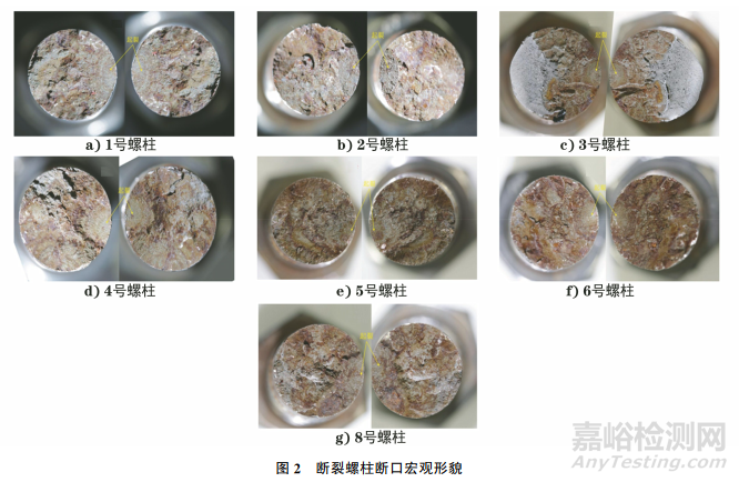 斷裂螺柱斷口宏觀形貌如圖2所示,送檢的8組雙頭螺柱中,一組是完好的,一組有裂紋但未完全斷開(kāi),其他6組彎曲斷開(kāi),且裂紋均位于中間螺桿處。除4,5號(hào)螺柱外,起裂位置距螺紋1.5cm左右,4,5號(hào)螺柱起裂位置距螺紋1.0cm左右。除5號(hào)螺柱外,中間螺桿長(zhǎng)度均約為3.5cm,5號(hào)螺柱中間螺桿長(zhǎng)度約為2.0cm。所有送檢螺柱上均有不同程度的銹跡,螺母表面較為干凈,與螺紋連接的內(nèi)螺紋表面有少許銹蝕產(chǎn)物。所有斷口均無(wú)塑性斷裂特征。
