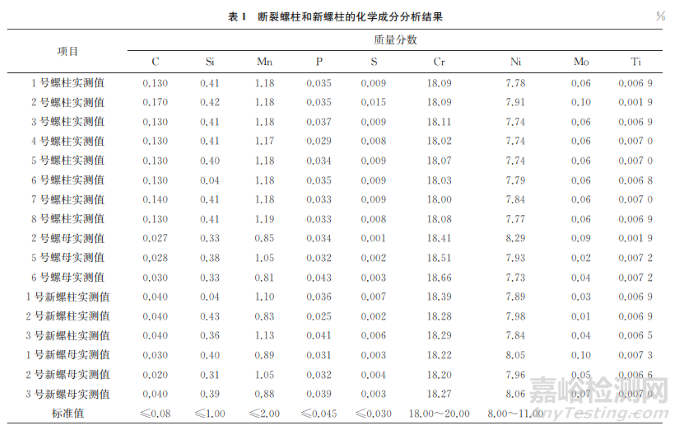 通過(guò)火花放電原子發(fā)射光譜法(常規(guī)法)對(duì)斷裂螺柱和螺母以及新螺柱和螺母的化學(xué)成分進(jìn)行分析,結(jié)果如表1所示。由表1可知:斷裂螺柱的碳、錳元素的質(zhì)量分?jǐn)?shù)比其螺母高,尤其是碳元素的質(zhì)量分?jǐn)?shù)更高。斷裂螺柱及螺母材料為304不銹鋼。斷裂螺柱的碳元素質(zhì)量分?jǐn)?shù)均不符合標(biāo)準(zhǔn)GB/T 1220—2007《不銹鋼棒》的要求;新螺柱和螺母的碳元素質(zhì)量分?jǐn)?shù)均符合標(biāo)準(zhǔn)GB/T 1220—2007的要求。