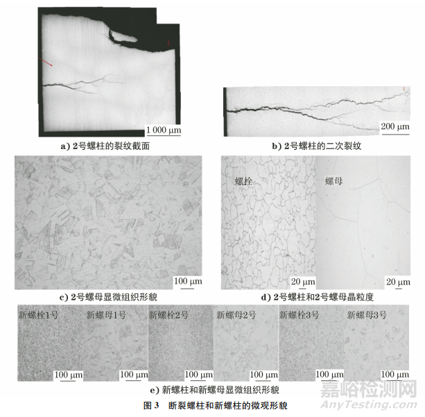 2號(hào)斷裂螺柱的斷口附近有二次裂紋,在垂直于裂紋方向截取金相試樣,在新螺柱上截取金相試樣,將2號(hào)斷裂螺柱試樣和新螺柱試樣置于光學(xué)顯微鏡下觀察,結(jié)果如圖3所示。由圖3可知:裂紋沿晶分布,且呈樹(shù)枝狀擴(kuò)展特征;2號(hào)斷裂螺柱晶粒度為9.2級(jí),螺母晶粒度為4.2級(jí);新螺柱晶粒度為9.5級(jí),新螺母晶粒度分別為6.0,2.5,4.5級(jí)。