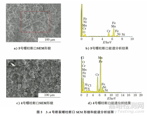 對(duì)螺柱裂紋斷口進(jìn)行掃描電鏡和能譜分析,結(jié)果如圖5所示。由圖5可知:斷口形貌主要呈沿晶分布特征,斷口晶界表面可見(jiàn)腐蝕產(chǎn)物附著;能譜分析顯示斷口表面含有硫、氯等腐蝕性介質(zhì)元素。