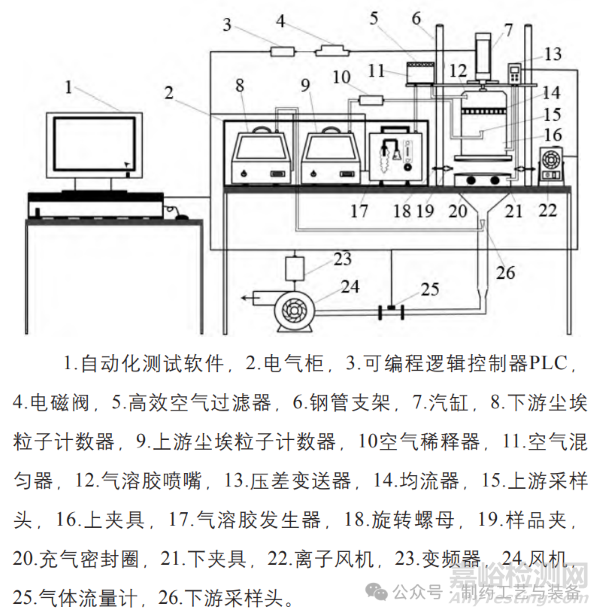相比國(guó)標(biāo)規(guī)定的空氣粒子過(guò)濾效率檢測(cè)方法,筆者建議的方法中增加了去靜電前后的過(guò)濾效率,規(guī)定了樣品測(cè)試的溫濕度要求,所以原本的檢測(cè)臺(tái)應(yīng)同步配備靜電計(jì)、離子風(fēng)機(jī)和恒溫恒濕間,如圖2所示。