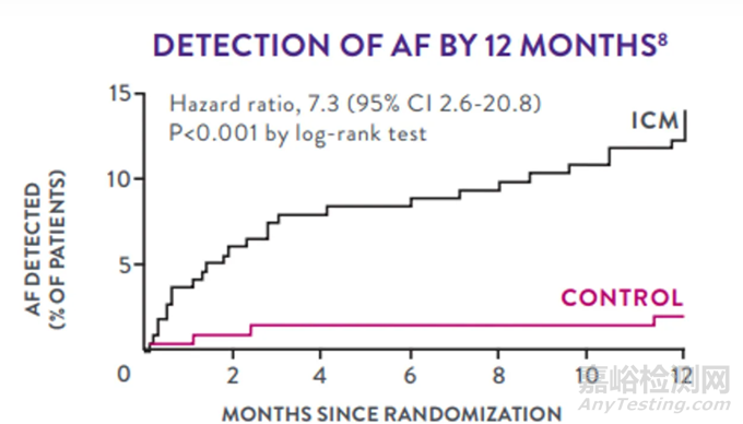 一項(xiàng)發(fā)表在《新英格蘭醫(yī)學(xué)雜志》上的研究表明,對于檢測隱源性卒中患者房顫發(fā)生情況,與常規(guī)短期的動態(tài)心電圖相比,ICM 可明顯提高房顫的檢出率,12個月內(nèi) ICM 檢出率為常規(guī)診斷的 7.3 倍。