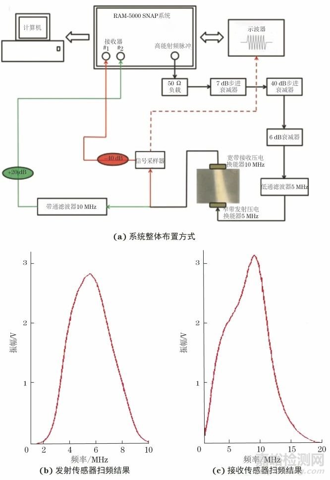 圖2 非線性超聲試驗系統(tǒng)示意及發(fā)射、接收傳感器的掃頻結果