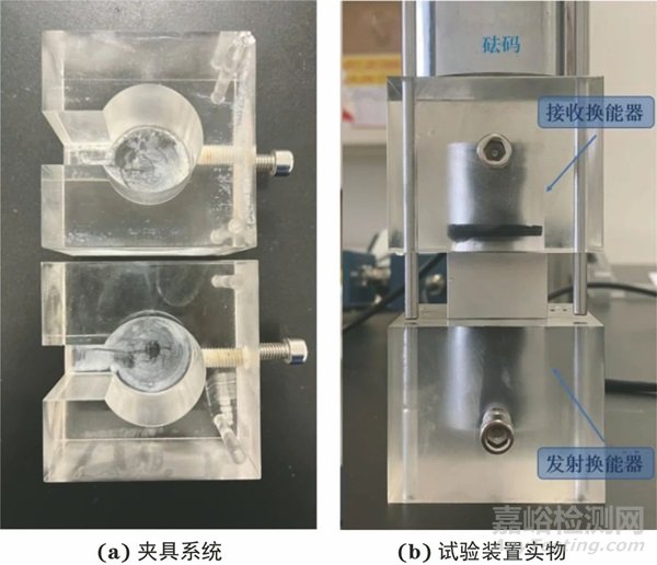 試驗所用耦合劑為高純度甘油,同時為了保證試驗結果的穩(wěn)定性,自行設計了夾具系統(tǒng),通過具有相同位置開孔的上下兩塊有機玻璃模具保證兩換能器的共線,并且每次測量均采用相同質量的砝碼置于有機玻璃上方,保證換能器與試件間的接觸壓力一致,間接保障了每次測量中耦合條件的一致,夾具系統(tǒng)及試驗裝置實物如圖3所示。