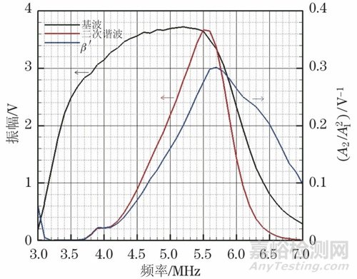 首先對不同頻率下(3~7 MHz)的基波、二次諧波幅值進行測量,并計算相應的相對非線性系數,變化曲線如圖4所示,其中黑色線為基波幅值隨頻率的分布,紅色線為二次諧波幅值隨頻率的分布,藍色線為計算出的不同頻率下的相對非線性系數。