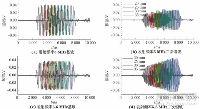 圖6 兩種激勵頻率下,不同厚度試件的基波、二次諧波接收時域信號