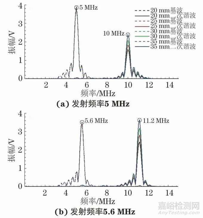 發(fā)射、接收傳感器掃頻結果如圖2(b)、(c)所示,可以看出發(fā)射換能器峰值頻率接近5 MHz,而接收換能器在5 MHz、10 MHz都具有較好的響應,能夠滿足同時接收基波與二次諧波的能力。