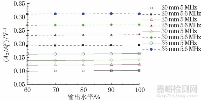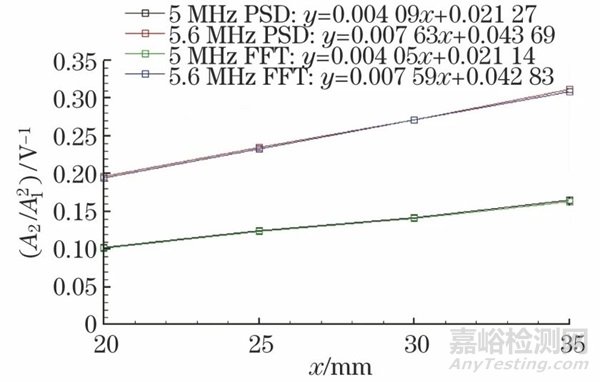 在聲波發(fā)射頻率為5 MHz時,斜率截距之比為0.1542,斜率為0.00391。聲波發(fā)射頻率為5.6 MHz時,斜率截距之比為0.1539,斜率為0.00744??梢钥闯?,兩種聲波發(fā)射頻率下的斜率截距之比接近,即檢測分辨力接近,而5.6 MHz情況下的斜率更高,則說明其檢測靈敏度更高,故聲波發(fā)射頻率為5.6 MHz的試驗參數更優(yōu)。