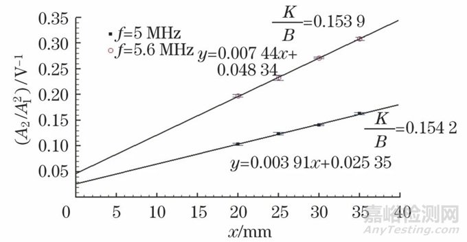 設x1、x2為兩個不同試件的厚度,且x1<x2,則系統(tǒng)的檢測分辨力大對應于不同非線性源的區(qū)分度大,該線性系統(tǒng)下等同于x1、x2固定情況下的(Kx2+B)/(Kx1+B)值,推導可得到隨著斜率截距之比(K/B)的增大檢測分辨力提高,故可用(K/B)表征檢測分辨力。