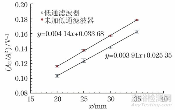 分別計算出兩種連接方式下斜率截距比為0.1542和0.1229,兩種連接方式的斜率分別為0.00391和0.00414??梢钥闯觯噍^于未加低通濾波器的連接方式,加入低通濾波器后系統(tǒng)的檢測靈敏度大致相同,但檢測分辨力明顯提高,故加入低通濾波器時檢測效果更優(yōu)。