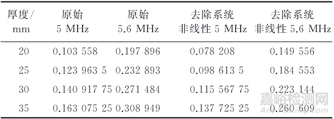 試驗中試件厚度依次為20,25,30,35 mm,由于材料相同,表面狀況相同,故其非線性系數之比理論上應為1∶1.25∶1.5∶1.75。由于系統(tǒng)非線性的干擾,實際測量值如表1所示,5,5.6 MHz聲波發(fā)射頻率下所得相對非線性系數之比分別為1∶1.197∶1.361∶1.575及1∶1.177∶1.372∶1.561。