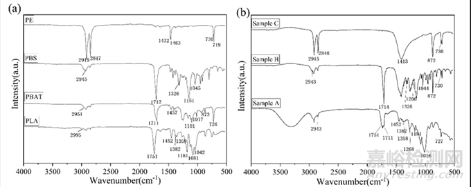 (a)純PLA、PBAT、PBS、PE的紅外光譜圖;(b)摻雜共混塑料及含填充料的