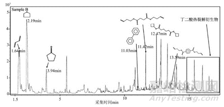 運(yùn)用熱裂解-氣相色譜質(zhì)譜技術(shù)進(jìn)一步對(duì)樣品B和C進(jìn)行測(cè)試。
