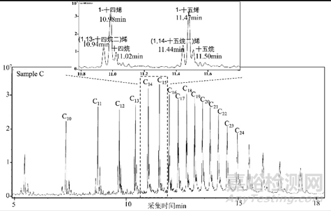 樣品C的熱裂解譜圖如圖3所示。譜圖中含有明顯的三聯(lián)體峰型,并檢出多種烯烴、烷烴類物質(zhì),如1,13-十四烷二烯、1-十四烯、正十四烷、1-十五烯等,由于PE熱解后通常會(huì)生成一系列α、ω-二烯、α-烯烴和正構(gòu)烷烴,是典型的三聯(lián)體。因此可推斷樣品C的主要成分為PE,同時(shí)根據(jù)GB/T 20197—2006[4],樣品C不屬于可生物降解塑料。