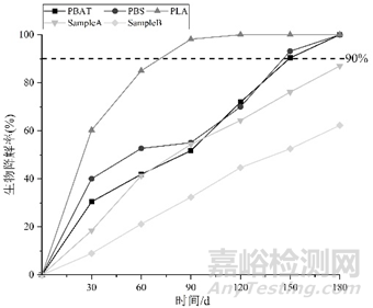 盡管利用傅里葉-紅外光譜技術(shù)、熱裂解-氣相色譜串聯(lián)質(zhì)譜技術(shù)鑒定樣品A與樣品B中主要成分為可生物降解塑料,但樣品A與樣品B在180天內(nèi)的生物降解率只有87.02%和62.24%,均未達(dá)到90%的降解率,因此二者均不屬于可生物降解塑料制品。