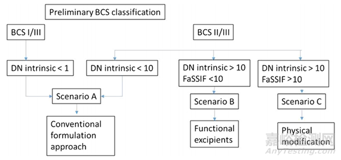 從決策樹可以看到,有三種不同的配方方案(A、B和C)。配方方案A用于固有DN(水中DN)<10的化合物。屬于方案A項下化合物可以擬定常規(guī)制劑開發(fā),如普通片劑、膠囊劑、溶液劑或者混懸液等,預計不會出現生物利用度問題;固有DN>10的化合物可分為兩類。固有DN>10和在FaSSIF<10中DN的化合物歸于方案B,在水中和FaSSIF中DN>10的化合物被認為方案C可以有針對的提高化合物的體內吸收。