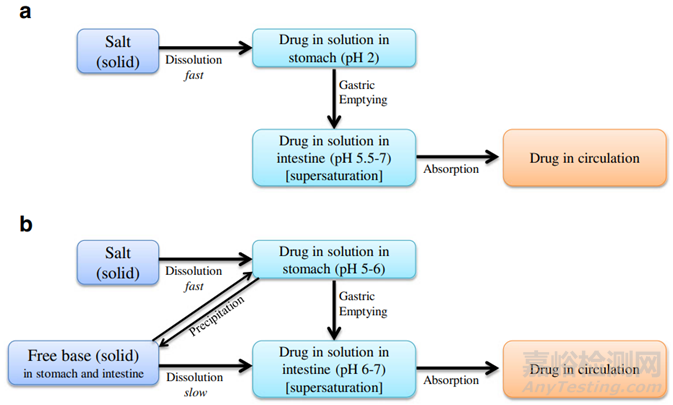 (a)在正常酸性胃pH條件下的藥物吸收。(b)在升高的胃pH條件下的藥物吸收。在胃pH升高時,藥物以游離堿形式沉淀會導致藥物溶出減慢。