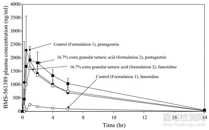 對于表現出胃pH依賴性藥物吸收的藥物,微環(huán)境的酸化和制劑的快速崩解可以幫助實現藥物的完全釋放。利用酒石酸提供酸性微環(huán)境,并克服Xa因子抑制劑藥物BMS-561389的胃pH相互作用。該藥物是一種弱堿鹽酸鹽,具有非常低的固有溶解度和兩個堿性pKa值(2.2和7.4)。它表現出pH依賴性溶解度,在較低pH下溶解度更高。雖然該藥物在正常胃pH條件下似乎被很好地吸收,當速釋片劑與H2受體拮抗劑共同給藥時,在狗中觀察到血漿AUC和Cmax的顯著降低。作者假設,在這些情況下,口服生物有效性的降低是由于游離堿的沉淀,其表現出緩慢的溶出速率(圖2)。作者能夠通過在制劑中添加16.7%的酒石酸來克服該化合物的這種胃pH相互作用,這在狗模型中得到了驗證(圖3)。