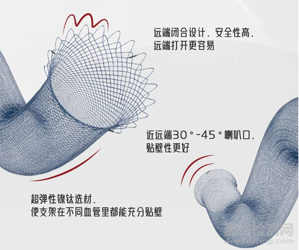 2.極致貼壁,安全有效:遠(yuǎn)端閉合設(shè)計(jì),安全性更高;近、遠(yuǎn)端30°-45°喇叭口,貼壁性更好;優(yōu)化的編織設(shè)計(jì),兼顧貼壁性與徑向支撐力