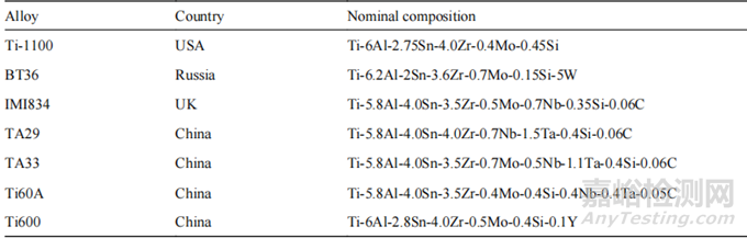 進(jìn)入21 世紀(jì),我國在600 ℃高溫鈦合金研制方面取得突破成果,研制出 Ti60、Ti600 和 TA29 等 合金。中國科學(xué)院金屬研究所與寶鈦集團有限公司聯(lián)合研發(fā)了具有優(yōu)良綜合性能的 Ti60(TA33)合金,在高溫下具有較高的穩(wěn)定性和抗氧化性。在 Ti-1100 合金的基礎(chǔ)上,西北有色金屬研究院研 發(fā) 了 Ti600 合 金,目 前 已 達(dá) 到 中 試 規(guī) 模 。2000 年北京航空材料研究院創(chuàng)制了 TA29(TG6)合金,不含Mo元素,添加 1.5%(質(zhì)量分?jǐn)?shù),下同)Ta 可以提高合金強度,改善加工性能,適用于航空發(fā) 動機部件制備。目前,典型的 600 ℃ 高溫鈦合金包括美國的 Ti-1100,英國的IMI834,俄羅斯的 BT36 以及中國的TA29、TA33、Ti60A 和 Ti600 等以及最新固化成 分材料的 TA37(Ti150),上述合金均為 Ti-Al-SnZr-Mo-Si 系近 α 型高溫鈦合金,相應(yīng)的材料及名義成分見表1。