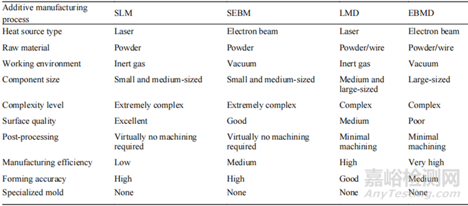 鈦合金的增材制造技術(shù)可分為直接能量沉積與粉末床熔化兩種。根據(jù)熱源不同,可分為激光熔化沉積(laser melting deposition, LMD)、電子束熔化沉積(electron beam melting deposition, EBMD)、 電弧熔 絲沉積 (wire arc additive manufacturing, WAAM)、激光選區(qū)熔化(selective laser melting, SLM) 和電子束選區(qū)熔化(selective electron beam melting, SEBM)五種工藝。目前 ,多采用激光增材制造 (laser additive manufacturing, LAM)和電子束增材 制造(electron beam additive manufacturing, EBAM) 來制備 600 ℃ 高溫鈦合金,電弧熔絲沉積則鮮有報 道,表 2 列出了四種 600 ℃ 高溫鈦合金增材制造工藝的技術(shù)特點。