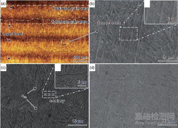 激光能量密度會顯著影響 LMD 合金的顯微組織。當(dāng)能量密度較大時,新層熔化時會使原沉積層充分重熔,進(jìn)而冷卻凝固形成粗大的外延生長的 β 柱狀晶;當(dāng)能量密度較小時,新層熔化不足以使原沉積層上部的等軸晶區(qū)充分重熔,便會形成層帶結(jié)構(gòu)。