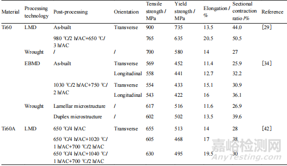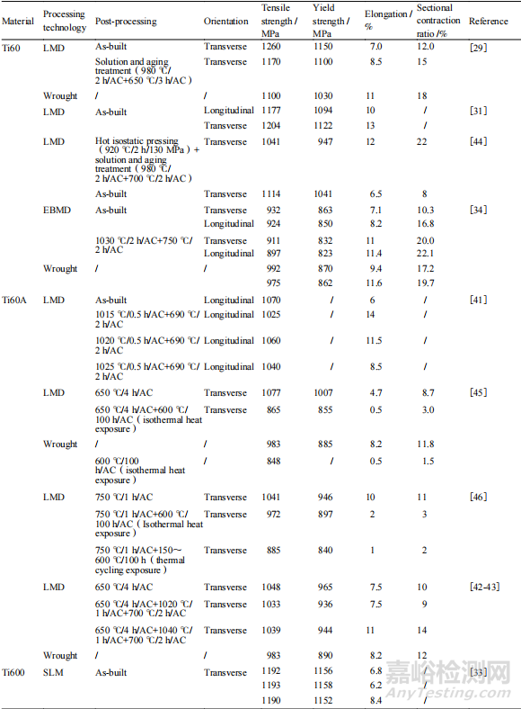 表3和表4分別為不同增材工藝和后處理方法下600 ℃高溫鈦合金的室溫和600 ℃ 拉伸性能。結(jié)合表中數(shù)據(jù)和文獻(xiàn)可得出如下結(jié)論: