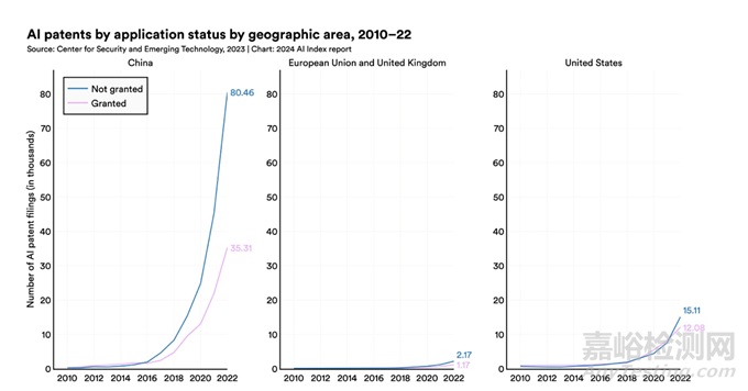 2023年,美國(guó)發(fā)布了61個(gè)值得關(guān)注的機(jī)器學(xué)習(xí)模型,歐盟和中國(guó)分別是21個(gè)和15個(gè)。但值得關(guān)注的是,中國(guó)已經(jīng)在2022年以61.1%的份額成為全球人工智能專利最大來(lái)源國(guó),美國(guó)人工智能專利份額則從2010 年的54.1%下降至2022年的20.9%。