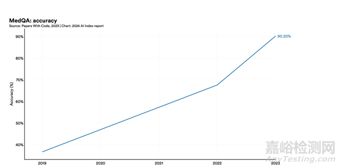 過(guò)去幾年,人工智能在MedQA(醫(yī)學(xué)文本問(wèn)答數(shù)據(jù)集)基準(zhǔn)上表現(xiàn)出了顯著的進(jìn)步,這是評(píng)估人工智能臨床知識(shí)的關(guān)鍵測(cè)試。GPT-4 Medprompt的準(zhǔn)確率達(dá)到了90.2%,比2022年的最高分提高了22.6 個(gè)百分點(diǎn)。自2019年推出該基準(zhǔn)測(cè)試以來(lái),人工智能的準(zhǔn)確性幾乎增加了兩倍。