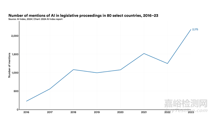 2023年,美國(guó)人工智能相關(guān)法規(guī)數(shù)達(dá)到了25個(gè),而2016年僅有1個(gè)。全球各國(guó)的法律法規(guī)提及人工智能的次數(shù)從2022年的1247次增加到2023年的2175次,幾乎翻了一番。