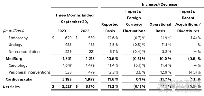 2023年10月26日,波士頓科學公布了2023年第三季度的財務報告。報告顯示,公司第三季度凈銷售額達 35.27 億美元,與去年同期相比,報告增長率為11.2%,運營增長率為11.1%,有機增長率為10.2%。