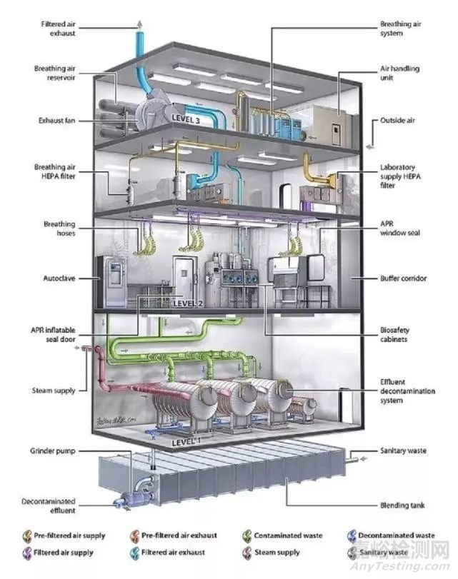 P4實(shí)驗(yàn)室作為最高級別的生物安全實(shí)驗(yàn)室,是應(yīng)對高危險性、且無法預(yù)防和治療的烈性病毒的利器。P4實(shí)驗(yàn)室一般為一棟獨(dú)立的建筑物,如與其他級別生物實(shí)驗(yàn)室共用建筑物,也需要在建筑物中占據(jù)獨(dú)立的隔離區(qū)域,并與附近的其他建筑物完全隔離。在常見的四層結(jié)構(gòu)中,一層為污水處理與保障設(shè)備,二層為核心實(shí)驗(yàn)區(qū),三層為排風(fēng)管道過濾層,四層為空調(diào)設(shè)備與送排風(fēng)管道。
