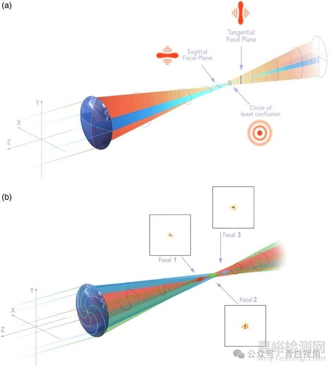 圖:(a) 傳統(tǒng)散光鏡片和 (b) 螺旋鏡片之間的比較。對于每個鏡片,
