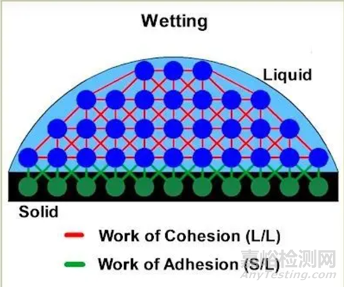 當(dāng)液體與固體表面保持接觸時(shí),就會(huì)發(fā)生濕潤(rùn)。發(fā)生潤(rùn)濕的程度(即潤(rùn)濕性)是由液體分子之間的內(nèi)聚力和由液體和固體之間的分子相互作用產(chǎn)生的粘合力決定的,如下圖所示。(在現(xiàn)實(shí)生活中,分子的組織并不那么整齊。)通常用接觸角來(lái)測(cè)量潤(rùn)濕性。