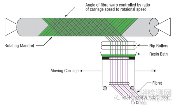 該工藝主要用于空心,通常為圓形或橢圓形的部件,如管道和儲罐。纖維束在纏繞到芯軸上之前要經過樹脂浴,芯軸的旋轉速度由纖維輸送機構和芯軸方向控制(圖2)。