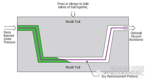 織物作為干燥的材料堆放,這些織物有時被預壓成模具形狀,并由粘合劑粘合在一起,然后將這些“瓶坯”更輕松地放入模具中。隨后將第二模具夾持在第一模具上,并將樹脂注入型腔。也可以將真空施加到模腔上,以幫助樹脂被吸入織物中。這被稱為真空輔助樹脂注射( Vacuum Assisted Resin Injection,VARI)。一旦所有的織物都被潤濕,樹脂入口就會關閉,層壓板就可以固化。注射和固化都可以在環(huán)境溫度或高溫下進行(如圖6所示)。