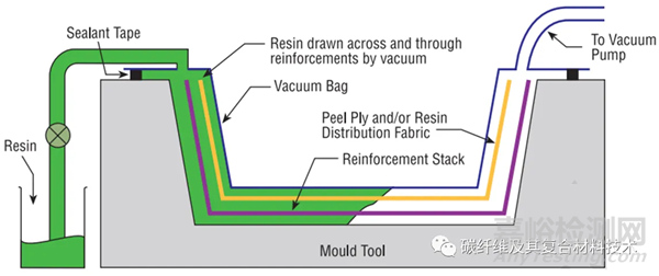 與RTM工藝類似,織物作為干燥的材料疊堆放置,然后用剝離層和編織型非結構織物覆蓋纖維堆,隨后對整個干堆進行真空袋裝,一旦袋裝泄漏消除,樹脂就可以流入層壓板。樹脂容易在非結構性織物中流動并從上方潤濕織物,從而有助于樹脂在整個層壓板上的分布(如圖7所示)。