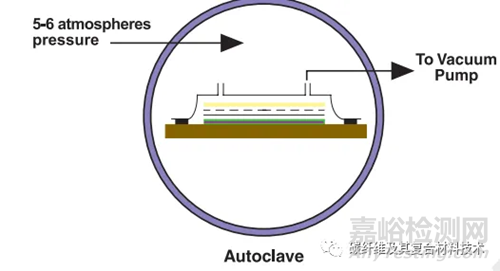 織物和纖維由材料制造商在加熱和加壓條件下或在溶劑中用樹脂預浸漬。催化劑在環(huán)境溫度下具有很大的潛伏性,使材料解凍后有數(shù)周或數(shù)月的使用壽命。但是為了延長儲存壽命,這些材料必須是冷凍儲存的。用手或機器將預浸料放置在模具表面,真空包裝,然后加熱到120-180°C,樹脂開始回流并最終固化。成型所需的額外壓力通常由高壓釜(實際上是加壓烘箱)提供,該高壓釜最多可向層壓板施加5個大氣壓,如圖8所示。