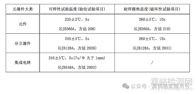 各類元器件可焊性試驗和耐焊接熱試驗的溫度不相同,詳見下表。