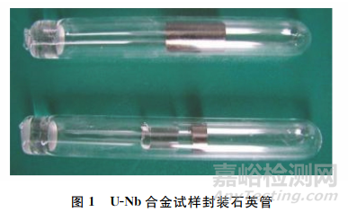 在99.998%(體積分?jǐn)?shù))的高純氬氣保護(hù)下,將純度為99.90% (質(zhì) 量 分 數(shù) )的鈮絲和純度為99.99%(質(zhì)量分?jǐn)?shù))的金屬U通過電弧熔煉熔化制成合金。為保證試樣成分的均勻性,每個試樣均反復(fù)熔煉4次。將熔煉獲得的試樣用石英管真空封裝(見圖1),然后在1000℃下保溫24h并進(jìn)行水淬,以保證試樣成分均勻。分別制備Nb元素質(zhì)量分?jǐn)?shù)為2.0%,3.5%,4.5%,5.7% 的4種U-Nb合金,分別編號為U-2Nb、U-3.5Nb、U-4.5Nb和U-5.7Nb。