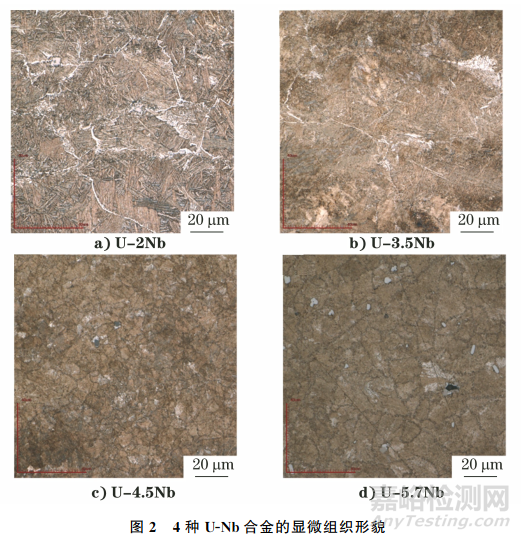 圖2為4種 U-Nb合金的顯微組織形貌。由圖2可知:U-Nb合金的顯微組織致密、均勻,Nb元素可以細(xì)化金屬U 的晶粒尺寸,有助于提升材料的力學(xué)性能;當(dāng)Nb元素的添加量 (質(zhì)量分?jǐn)?shù),下同)為2.0%時,材料的顯微組織中可觀察到大量粗針狀馬氏體;當(dāng)Nb元素的添加量增加至3.5%時,馬氏體變?yōu)榧?xì)針狀;當(dāng)Nb元素的添加量進(jìn)一步增加至4.5%時,細(xì)針狀馬氏體逐漸消失,形成了等軸晶組織。