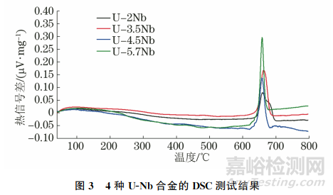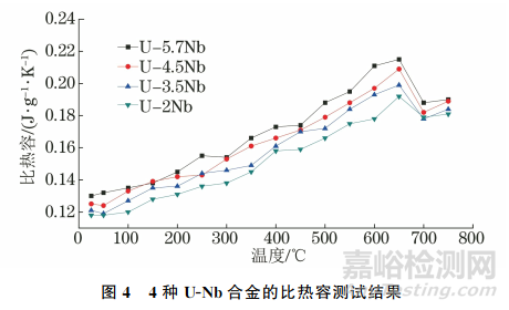 圖3為4種U-Nb合金的DSC測試結(jié)果。由圖3可知:4種U-Nb合金均在溫度為600~700℃時發(fā)生了顯著相變;U-2Nb合金的相變溫度為659.6℃,U-3.5Nb合金的相變溫度為663.1℃,U-4.5Nb合金的相變溫度為657.7℃,U-5.7Nb合金的相變溫度為658.1℃。結(jié)合U-Nb合金的平衡相圖可知,U-2Nb、U-3.5Nb、U-4.5Nb合金的相組成轉(zhuǎn)變?yōu)?alpha;+γ1,U-5.7Nb合金的相組成轉(zhuǎn)變?yōu)?gamma;1。U-Nb合金的相變過程伴隨著熱量的變化,進(jìn)而對合金的比熱容造成影響。